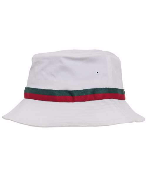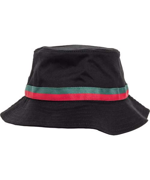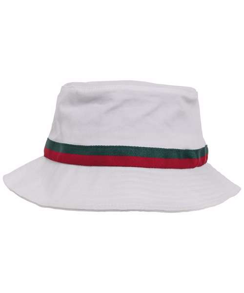 Stripe bucket hat. Enhanced with a circumferential brim. Decorative seam. Two-tone hat band in fire red and green.