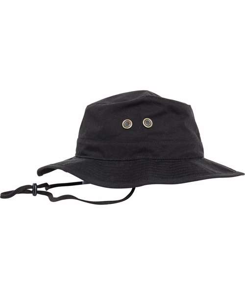 Angler hat. Wide flat brim with decorative stitching. Venting eyelets. Hat lace, and stopper.