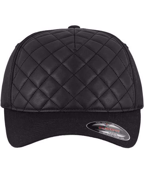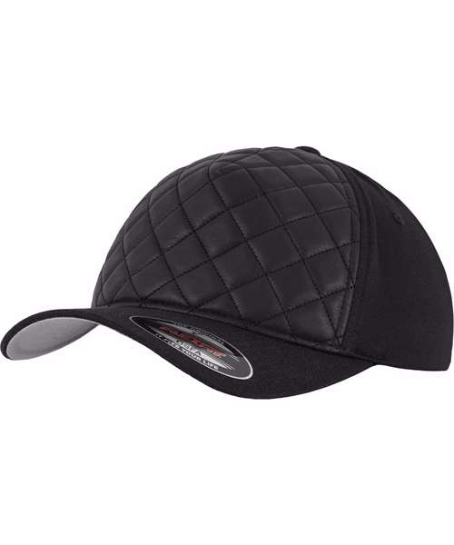 Diamond quilted Flexfit cap. Athletic Shape. Hard buckram. Silver coloured undervisor. Quilted leather imitation front.