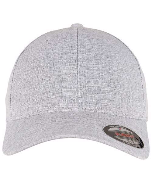Mottled colored cap with Flexfit technology, made from polyester and viscose with a small percentage of elastane, one size fits all, without extra closure, decorative seams, and pre-bent visor.