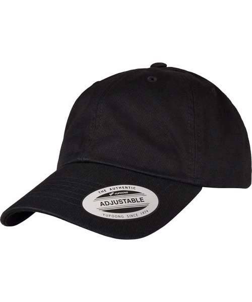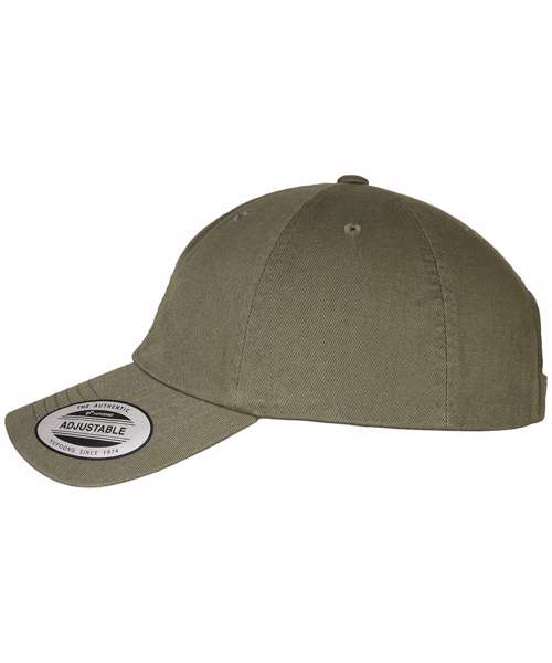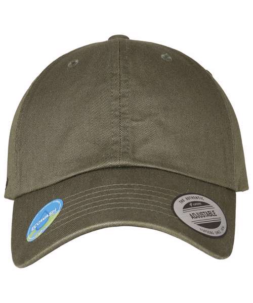 Masculine dad cap, new alpha shape, made from cotton, adjustable buckle closure, pre-curved, six-way quilted visor, innovative form. Fabric features a patented Ecowash process (US Patent Number: 12247341).