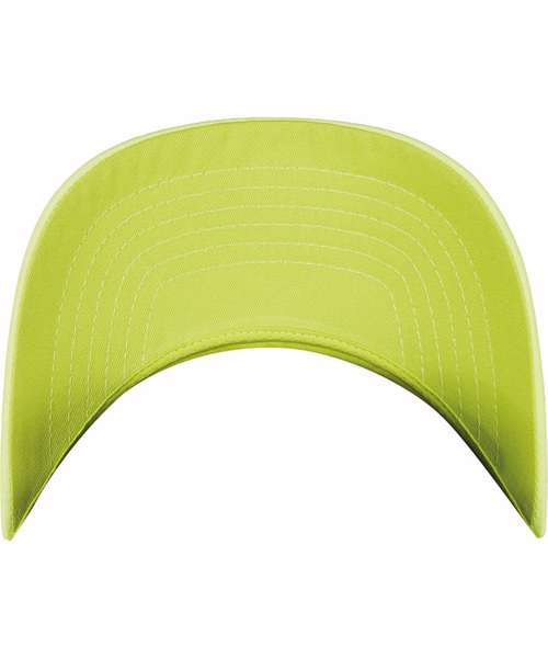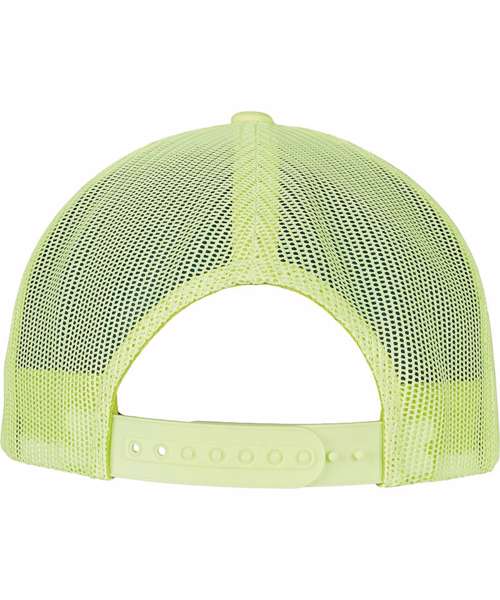 Trucker cap in bright neon colors, polyester mesh, adjustable, and color-matching snapback closure, straight, six-way quilted visor.